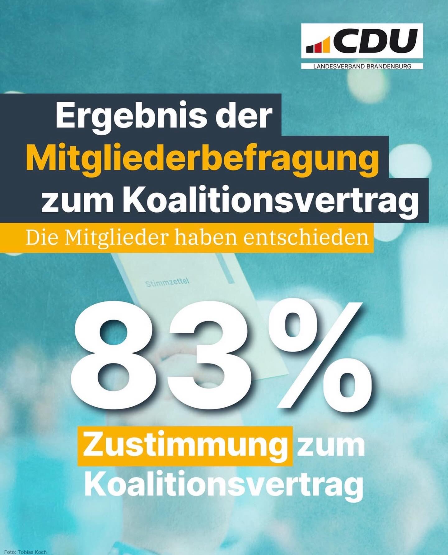 Bis gestern konnten die Mitglieder der CDU Brandenburg über den Koalitionsvertrag mit der SPD abstimmen ? heute werden die Ergebnisse der Mitgliederbefragung vorgestellt. Ein starkes Zeichen unserer innerparteilichen Demokratie: Viele Mitglieder haben sich beteiligt und damit Verantwortung für die Zukunft unseres Landes übernommen. Mit dem Koalitionsvertrag "Verantwortung für Brandenburg" setzen wir einen klaren Kurs für Stabilität, Sicherheit und wirtschaftliche Stärke. Für uns als CDU ist klar: Wir wollen Brandenburg verlässlich führen und Zukunft gestalten. Dabei wissen wir auch: Vertrauen entsteht nicht durch Worte allein. Es wächst Schritt für Schritt ? durch verantwortungsvolle Politik, durch Zuhören und durch Lösungen für die Menschen im Alltag. Wir wollen allen Brandenburgerinnen und Brandenburgern die Hand reichen, Brücken bauen und verloren gegangenes Vertrauen zurückgewinnen. 🤝 Für die CDU bedeutet das auch Verantwortung in zentralen Ressorts: ➡️ Inneres ➡️ Bildung ➡️ Wirtschaft Jetzt gilt: Ärmel hochkrempeln und anpacken. Für ein sicheres, starkes und modernes Brandenburg. Verantwortung für Brandenburg. Gemeinsam nach vorne. 💪 #CDUBrandenburg #CDUBernau #VerantwortungFürBrandenburg #Brandenburg #ZukunftGestalt